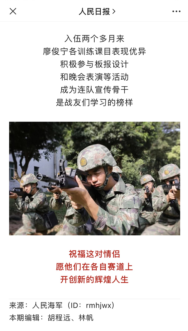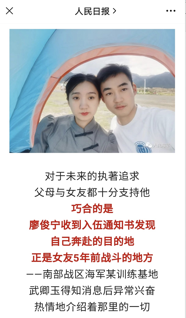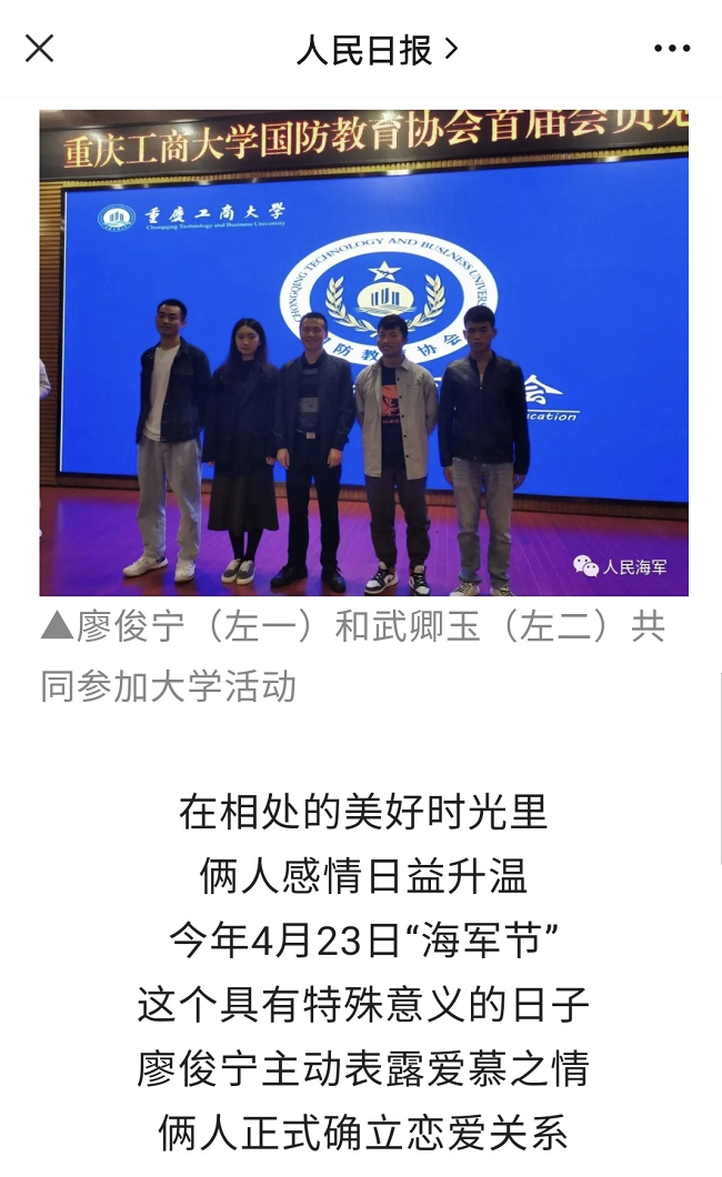 近日,人民日报和由海军政治工作部主管的人民海军微信公众号等主流媒体报道了毕业于我校的2022届机械工程学院廖俊宁同学和2022届工商管理学院武卿玉同学的从军事迹。他们这对学生情侣相继入伍、从军报国,书写了新时代青年的责任担当。为他们点赞!